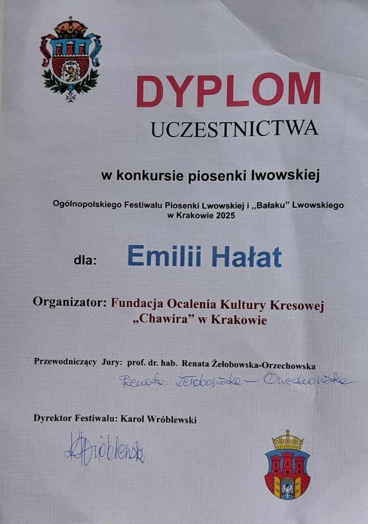 Jako finalistka II Bolesławieckiego Przeglądu Piosenki Kresowej zostałam zaproszona przez Panią Barbarę Smoleńską, Prezes Towarzystwa Miłośników Lwowa i Kresów Południowo-Wschodnich Oddział w Bolesławcu do udziału w 19. Ogólnopolskim Festiwalu Piosenki Lwowskiej i „Bałaku" Lwowskiego w Krakowie. W piątek 26 września wyruszyliśmy do Krakowa pod opieką Pani Aleksandy Sozańskiej-Kut i Izabeli Kulpy wraz dwójką uczniów ze Szkoły Podstawowej Nr 2 oraz jedną uczennicą ze Szkoły Podstawowej Nr 1 . W sobotę 27 września odbyły się eliminacje w sali teatralnej przy parafii Świętej Jadwigi Królowej w Krakowie. W trakcie przesłuchań zaprezentowałam dwa utwory: „Tyle jest Miast" oraz „Moje Serce zostało we Lwowie" przy akompaniamencie Pani Aleksandry Sozańskiej-Kut. Mimo, iż nie zostałam laureatką tego konkursu, było to dla mnie ogromne doświadczenie i wspaniała przygoda. Piosenki kresowe to piękne utwory, które pomagają mi zrozumieć jak żyli moi przodkowie we Lwowie i Wilnie i wzbudzają we mnie pozytywne odczucia. Naszą szkołę na eliminacjach reprezentowała również Nina Kosińska z klasy 7d, która zaprezentowała dwa utwory: „Imieniny we Lwowie" i „Bilet do Lwowa". Jej akompaniatorem był Jacek Welc. Nina odniosła ogromny sukces. Jej piękne aranżacje zdobyły uznanie jurorów i została wyróżniona.