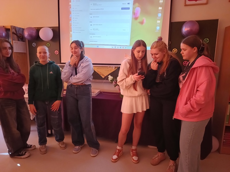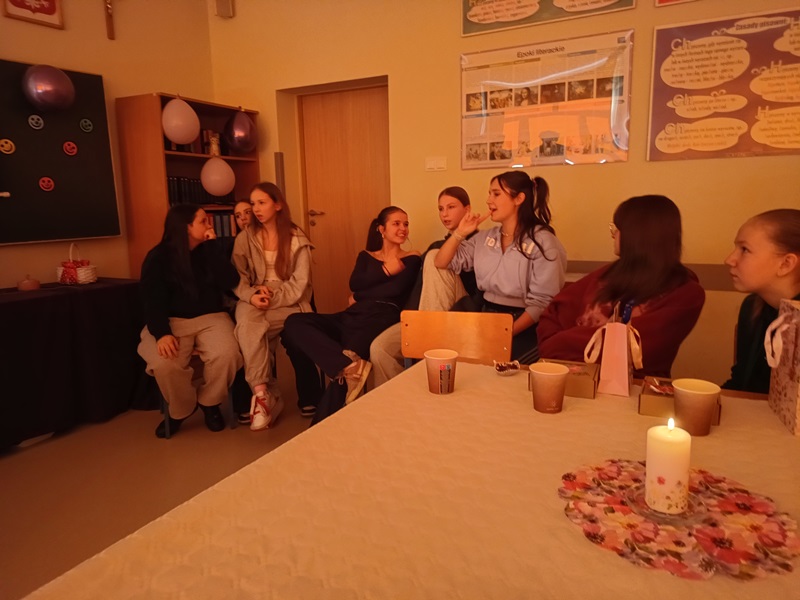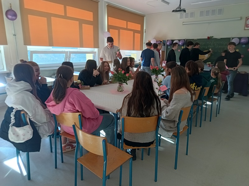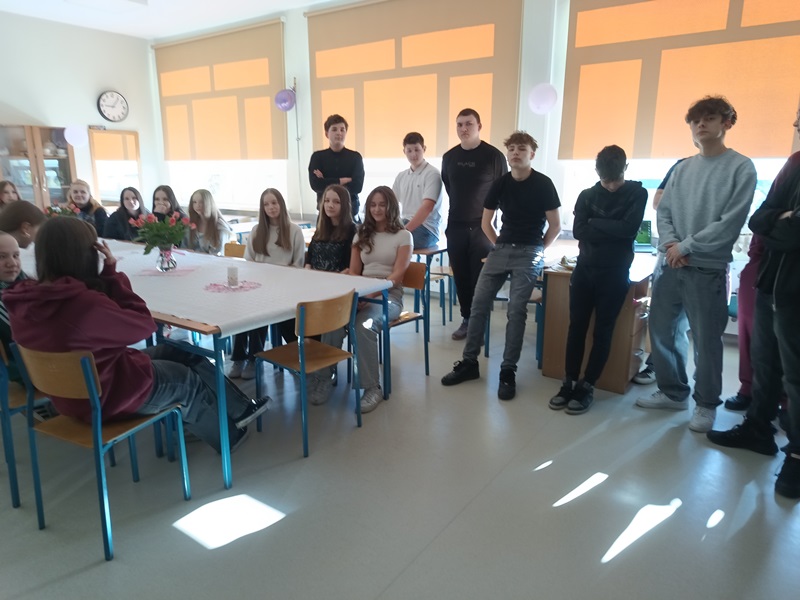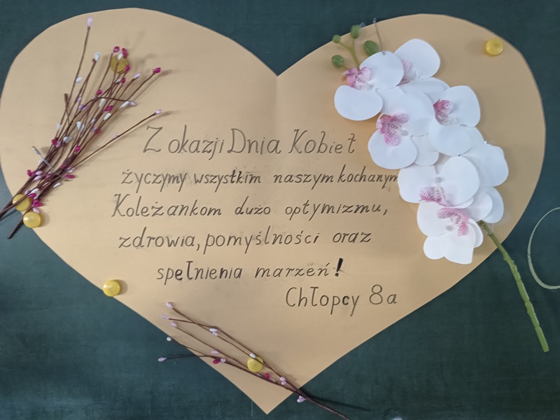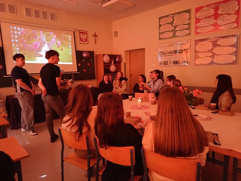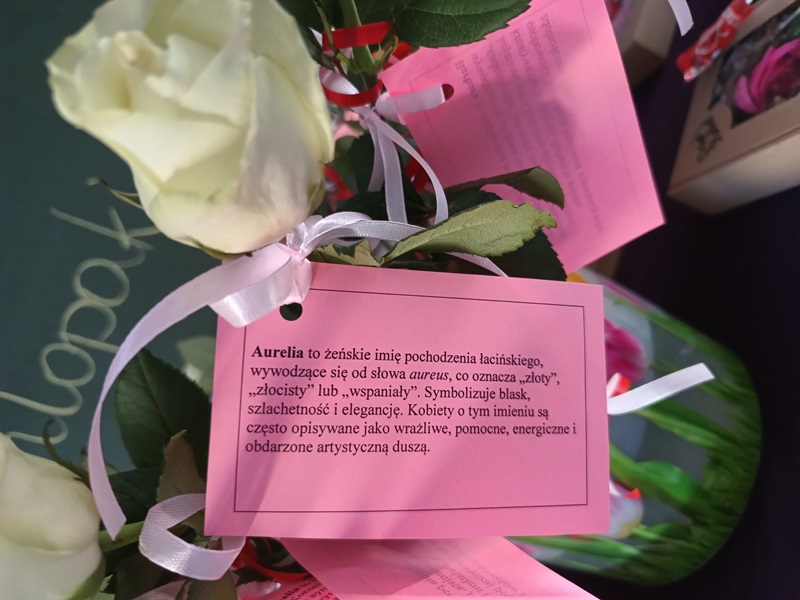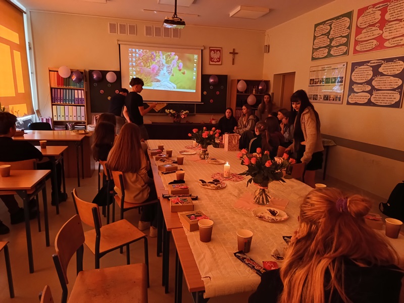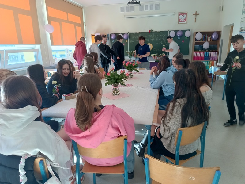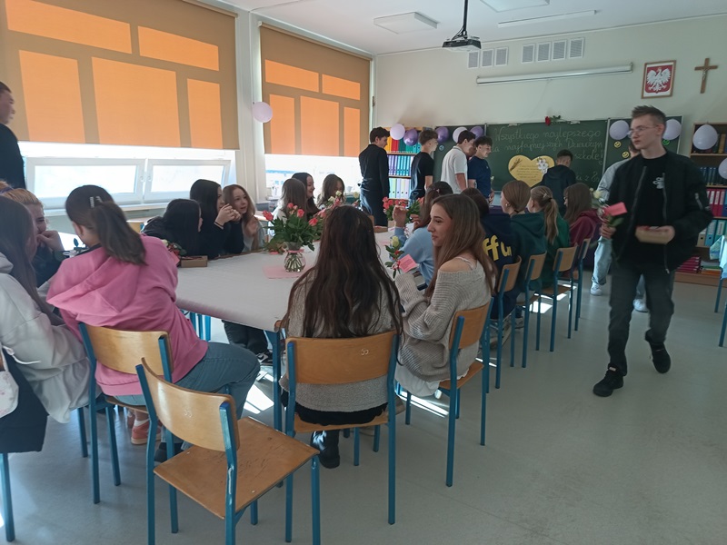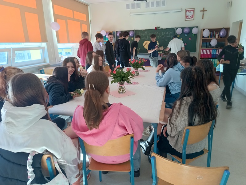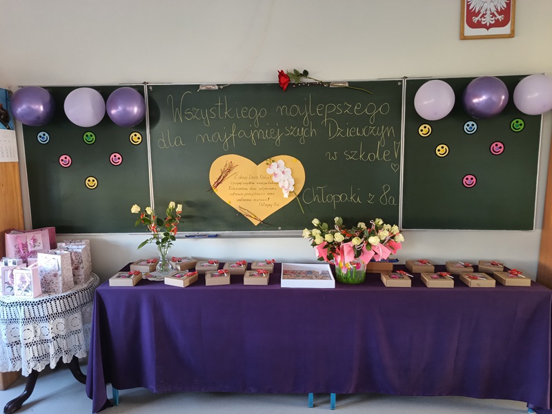 Nie inaczej odebrały to dziewczęta z klasy 8a, które zostały uhonorowane przez swoich kolegów pięknymi różami w kremowym kolorze. Chłopcy zadali sobie wiele trudu, gdyż do każdego kwiatu dołączyli bilecik ze znaczeniem imienia swojej koleżanki. To jednak był zaledwie przedsmak niespodzianek, jakie przygotowali dżentelmeni z 8a. Już w dzień poprzedzający klasowe święto chłopcy zostali w szkole do późnych godzin, aby wystroić salę balonami, przygotować plakat z życzeniami oraz ukryć w zakamarkach sali łakocie z imieniem każdej młodej damy. Dziewczynki musiały znaleźć swoje smakołyki, nieźle się przy tym natrudząc. Kryjówki były niezwykle pomysłowe, bo komu przyszłoby do głowy szukać wafelka w słowniku symboli lub za lustrem? Te słodkie podchody tylko zaostrzyły apetyt dziewcząt na kolejne niespodzianki, a było ich całe mnóstwo. Chłopcy wykazali się bujną wyobraźnią, przygotowując liczne konkursy oraz dobrymi manierami, prowadząc je z wdziękiem i delikatnością. Nie zapomnieli o żadnej koleżance, zadbali o piękne upominki i stworzyli niezapomnianą atmosferę tego dnia.