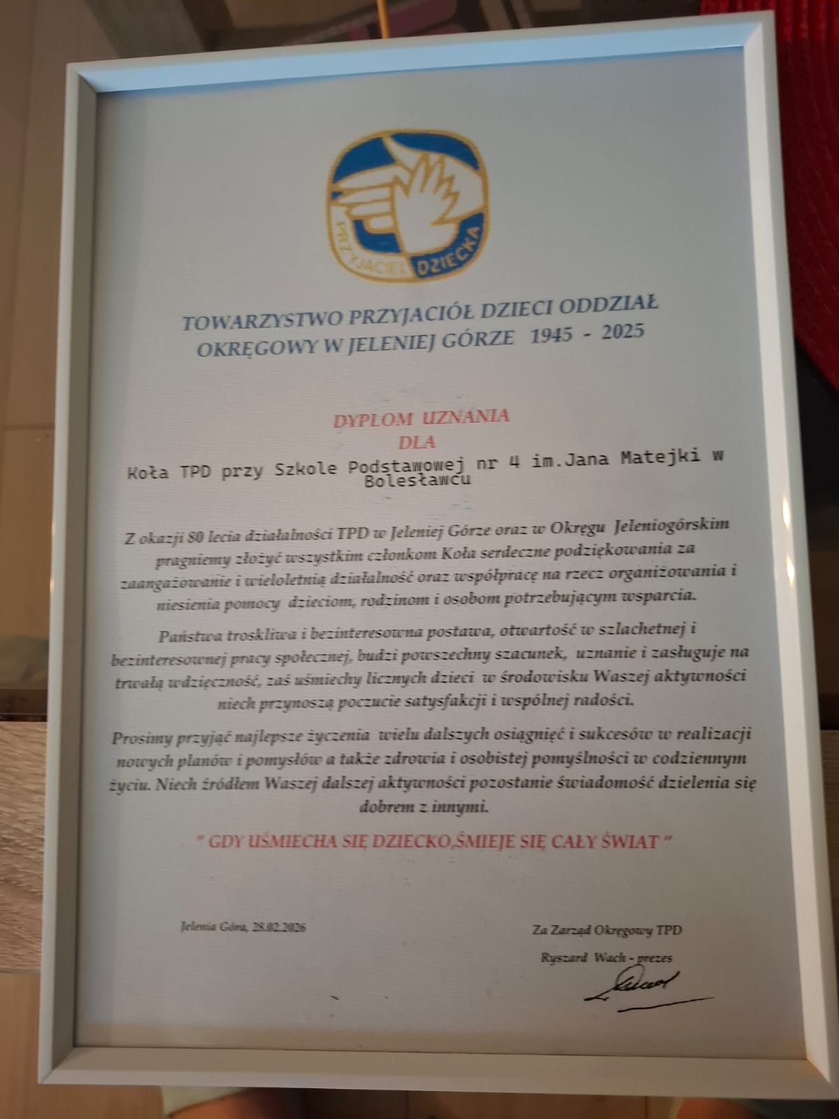 Z wielką przyjemnością przyjęliśmy piękne słowa uznania dla działającego w naszej szkole Koła TPD, którego opiekunkami są pedagodzy szkolni: Pani Lucyna Cichewicz i Pani Mariana Korczuk-Zamojska.
