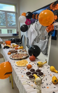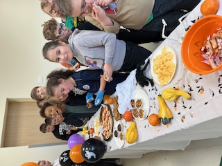 Dodatkową pokusą było wiaderko z cukierkami – za każdą poprawną odpowiedź w zagadkach uczniowie mogli wylosować słodki upominek. W klasie słychać było śmiech, doping i radosne okrzyki. Nie zabrakło też słodkiego poczęstunku: pojawiły się babeczki, „magiczne paluchy”, ciasteczka, owoce i chrupki duszki. Dzieci chętnie częstowały się i wspólnie świętowały ten wyjątkowy dzień. Spotkanie zakończyły tańce i wspólne zdjęcia, które na długo pozostaną w naszej pamięci.