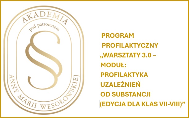 Nasza szkoła została zakwalifikowana do Pilotażu Programu Grantowego Akademii pod patronatem Anny Marii Wesołowskiej „Warsztaty 3.0 – Moduł: Profilaktyka Uzależnień od Substancji (edycja dla klas VII-VIII)”.