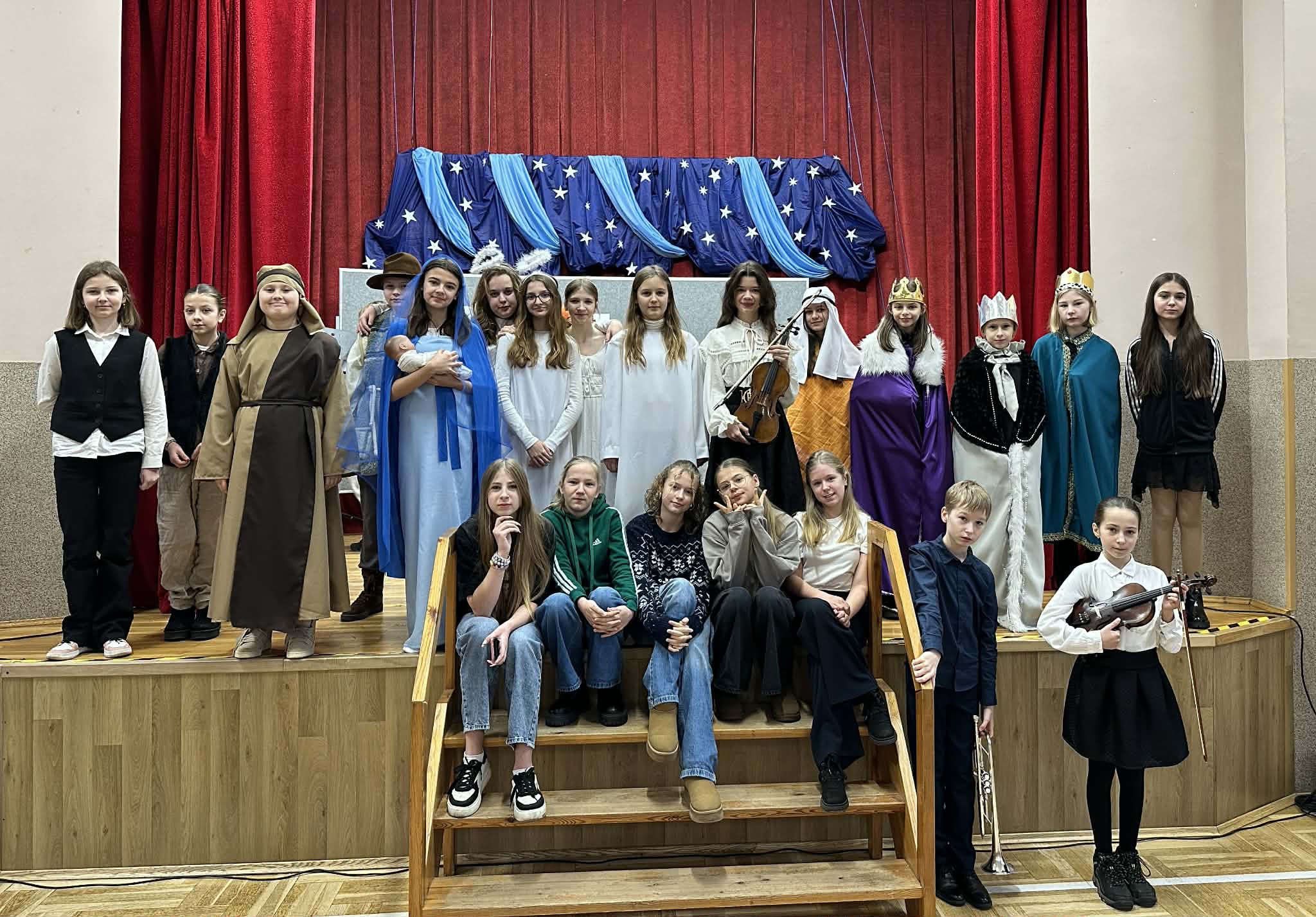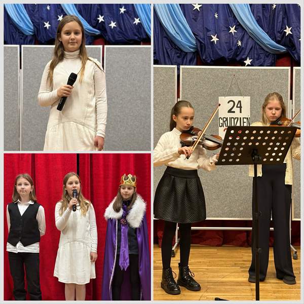 Z klasy 6c Emilia Kalinowska – skrzypce, Hania Sponar, Ola Chojnacka i Wanessa Kata – dzieci współczesne, Janek Korczyński – Józef i Amelia Bohun – Maryja,
