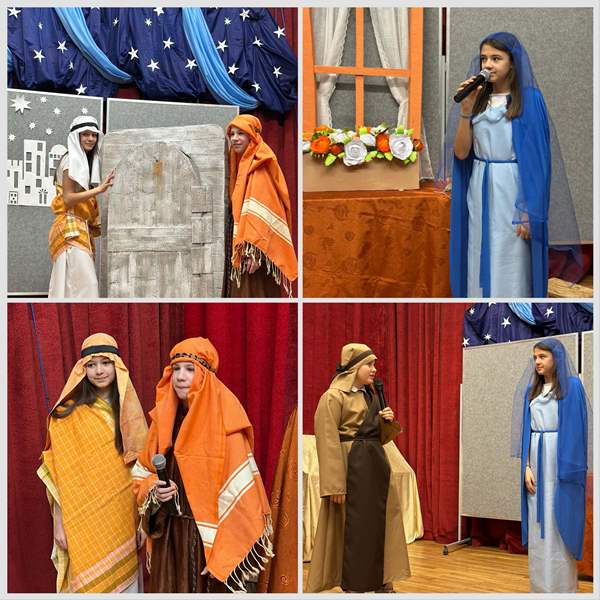 Z klasy 5b Liliana Perez, Maja Machnij i Wiktoria Stefan – królowie, Anastazja Kubiak – Archanioł Gabriel,