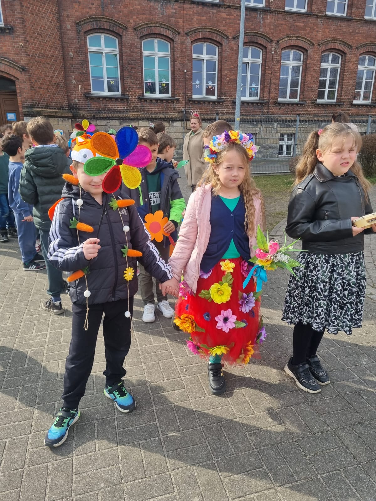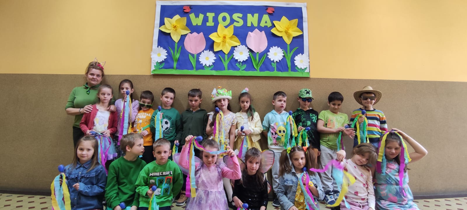 Rytm marszu wyznaczały radosne okrzyki i dźwięki instrumentów perkusyjnych oraz piosenka „Maszeruje Wiosna!”. Każda klasa przygotowała unikalny element stroju – widzieliśmy morze zielonych koszulek, kwieciste wianki oraz kolorowe sukienki.
