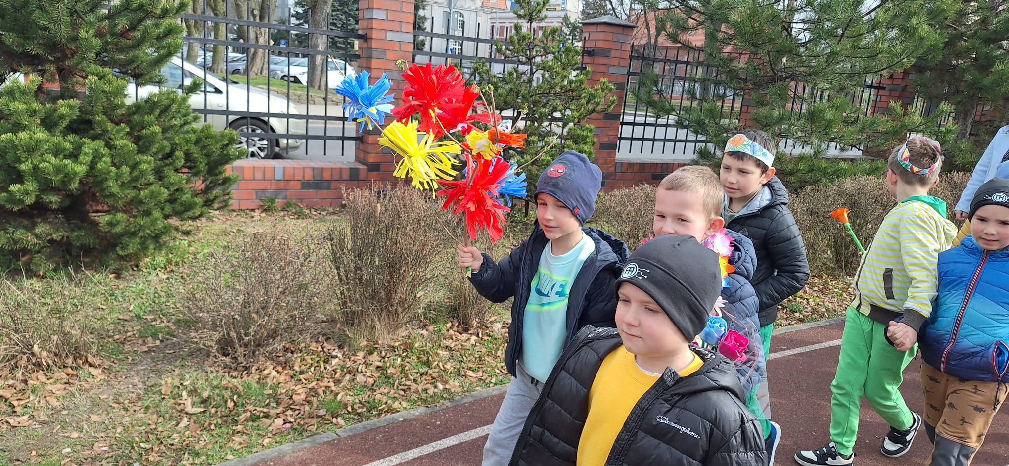 ręcznie robione marzanny – ekologiczne kukiełki, które symbolizowały odejście zimy, dzwoneczki, piękne kwiaty – bibułkowe tulipany i krokusy dumnie powiewały nad głowami maszerujących.