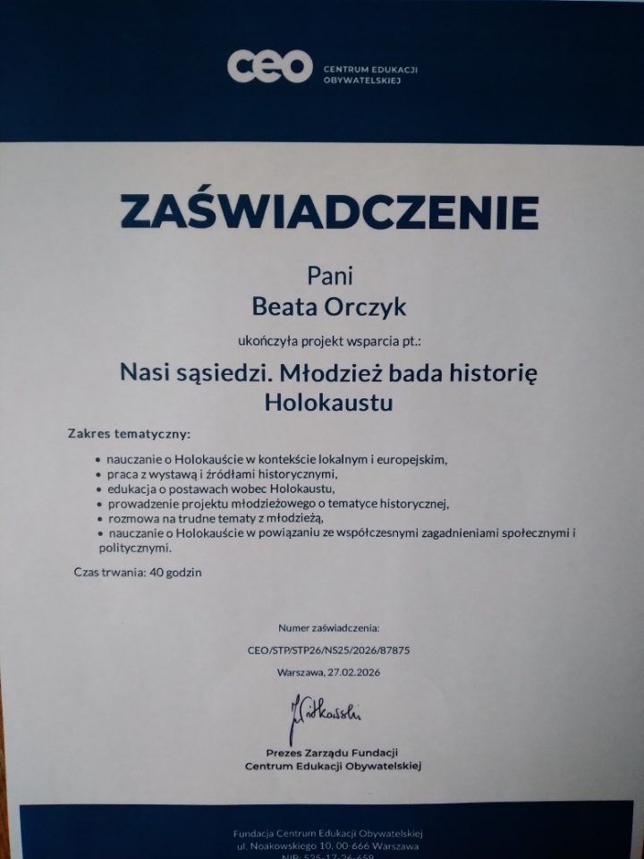 Wobec narastającego radykalizmu i ksenofobii, szkoła może być miejscem, które rozwija empatię i otwartość na różnorodność oraz pokazuje, jak reagować na niesprawiedliwość. Centrum Edukacji Obywatelskiej zaproponowało uczniom klas VIII szkół podstawowych udział w projekcie: NASI SĄSIEDZI.MŁODZIEŻ BADA HISTORIĘ HOLOKAUSTU przedstawiając uczniom, jakich wyborów dokonywali ludzie w czasie Holokaustu i z czego one wynikały. Nauczyciele otrzymali możliwość skorzystania z scenariuszy lekcyjnych opartych na wystawie „Byli sąsiadami: Ludzkie wybory i zachowania w obliczu Zagłady” przygotowanej przez Amerykańskie Muzeum Pamięci Holokaustu w Waszyngtonie, które stworzyli cenieni eksperci i ekspertki.