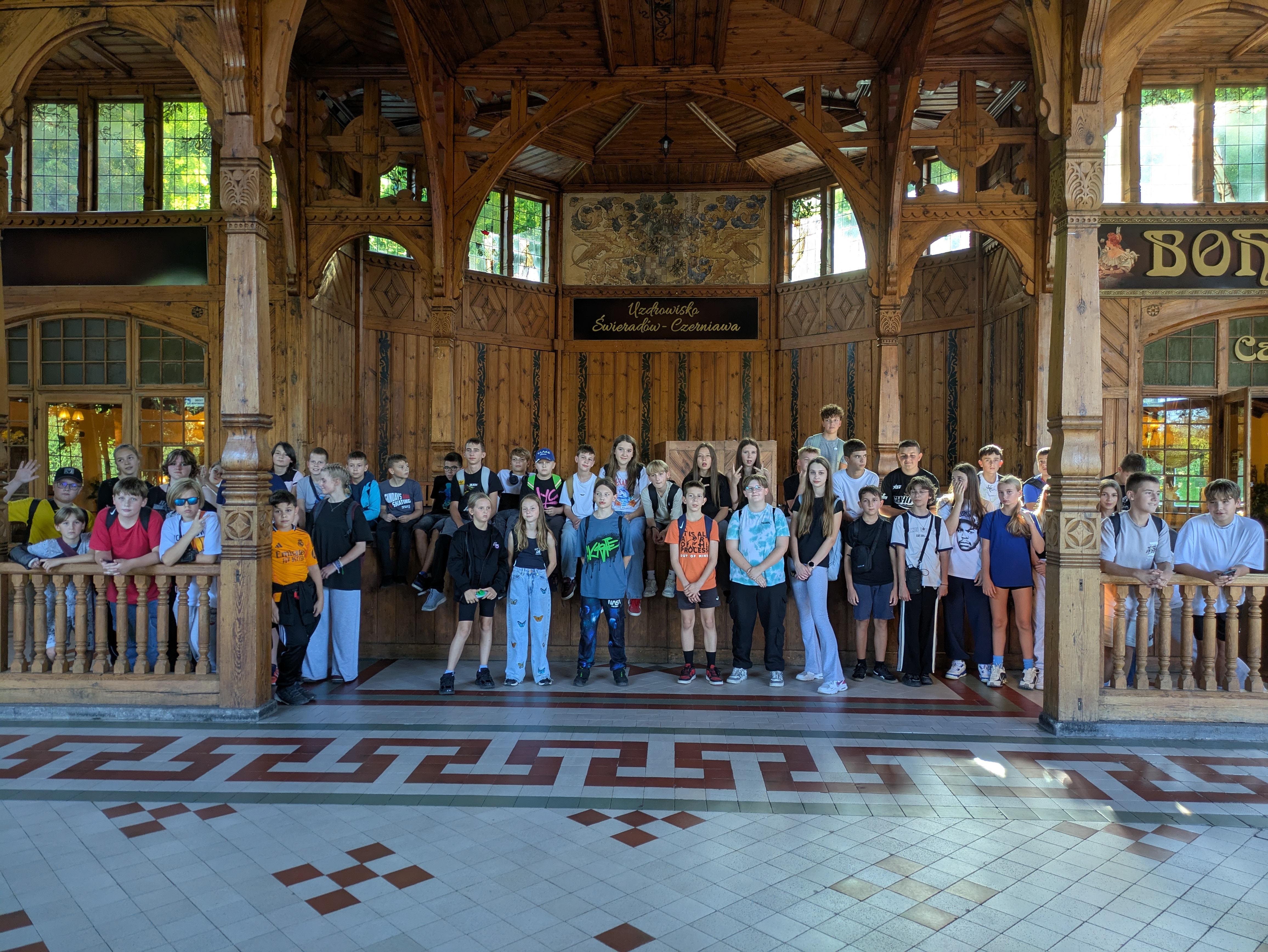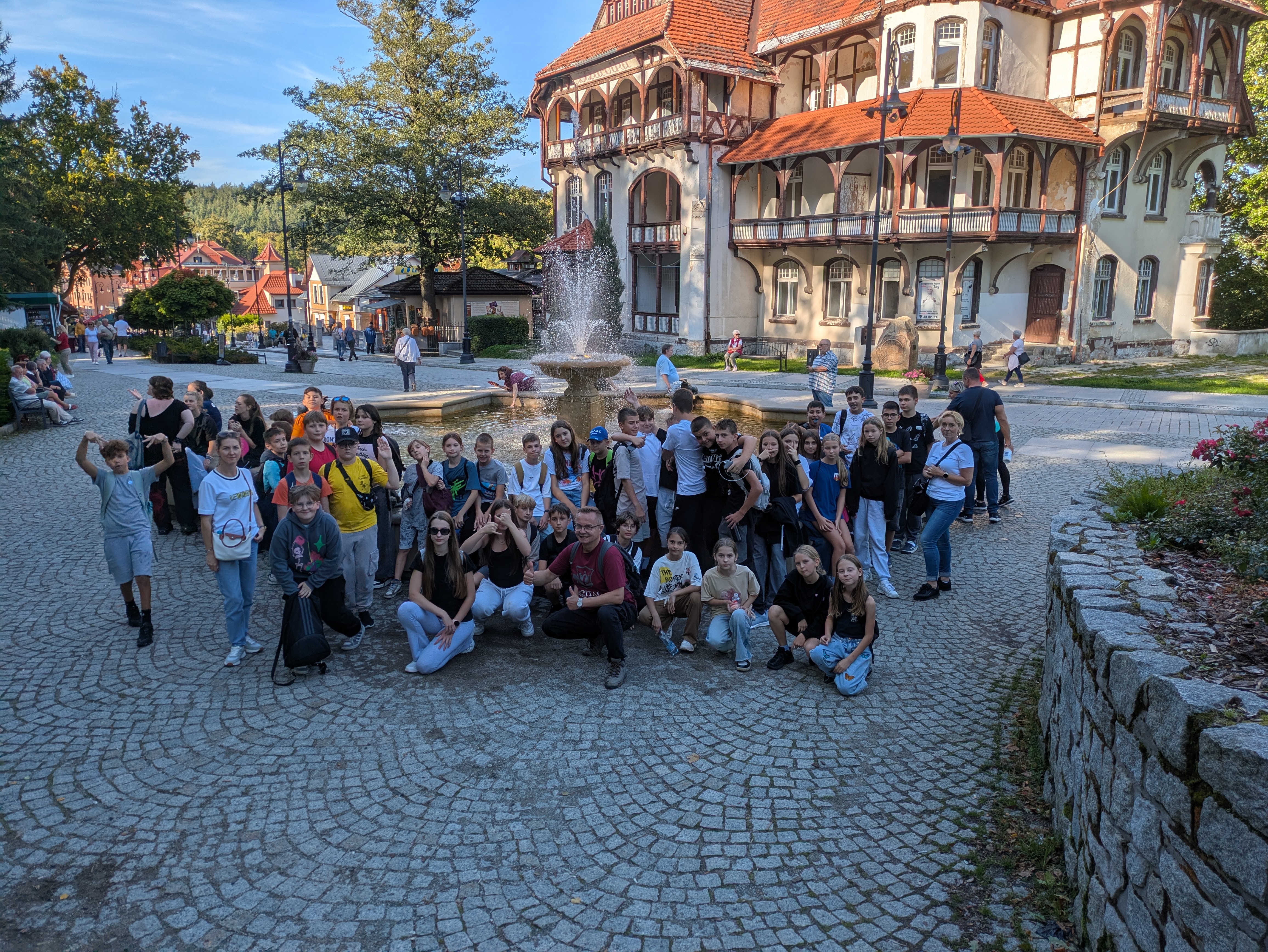 Zwieńczeniem wycieczki było zwiedzanie centrum Świeradowa-Zdroju. Podziwialiśmy imponujący Dom Zdrojowy wraz z imponującą Halą Spacerową, próbowaliśmy leczniczej wody mineralnej (ciekawy smak), a spacer zakończyliśmy wspólnym, pamiątkowym zdjęciem przy urokliwej Fontannie z żabkami - symbolu Świeradowa na pamiątkę legendy o berlińskim lekarzu, który odkrył lecznicze działanie miejscowych wód dzięki martwej, ale nie rozkładającej się żabie leżącej w źródle.