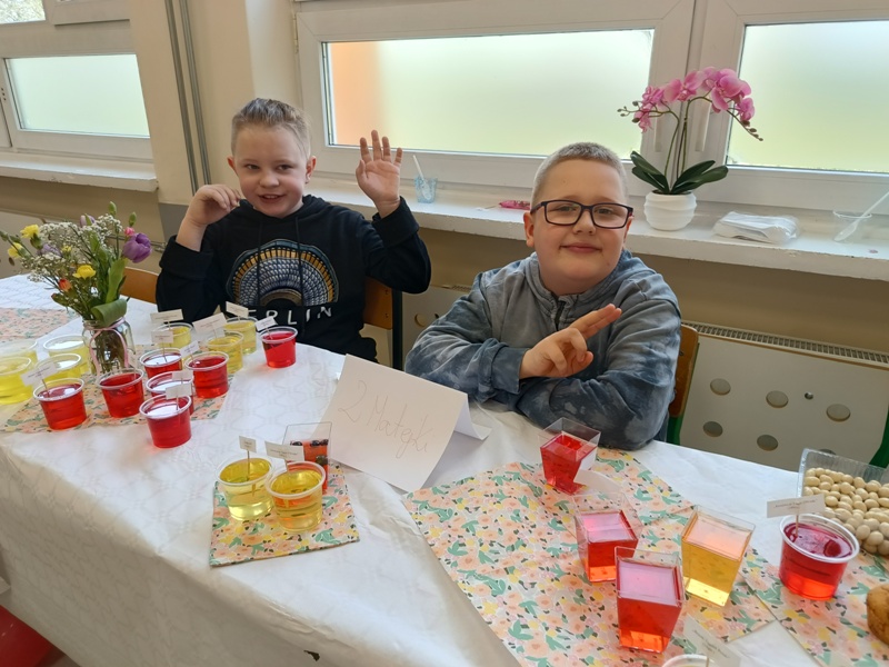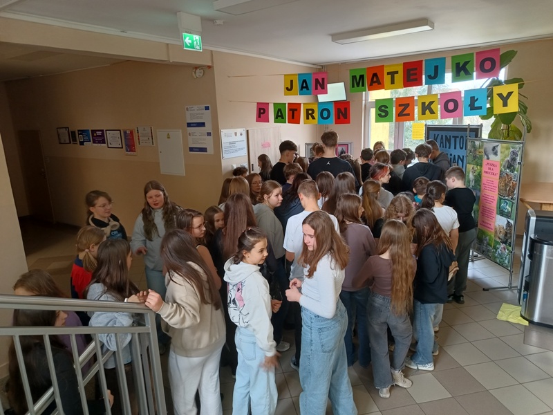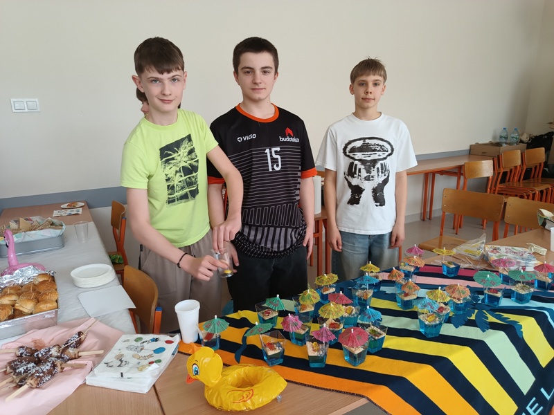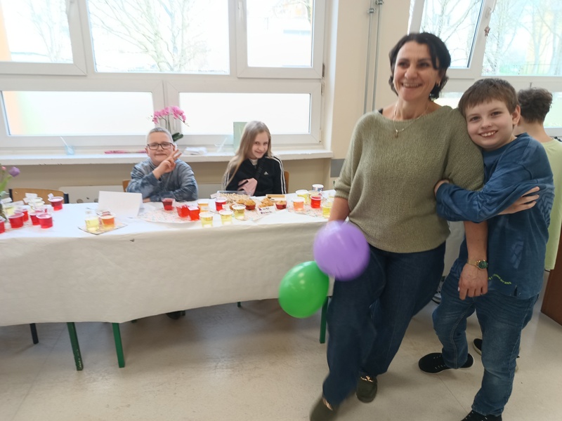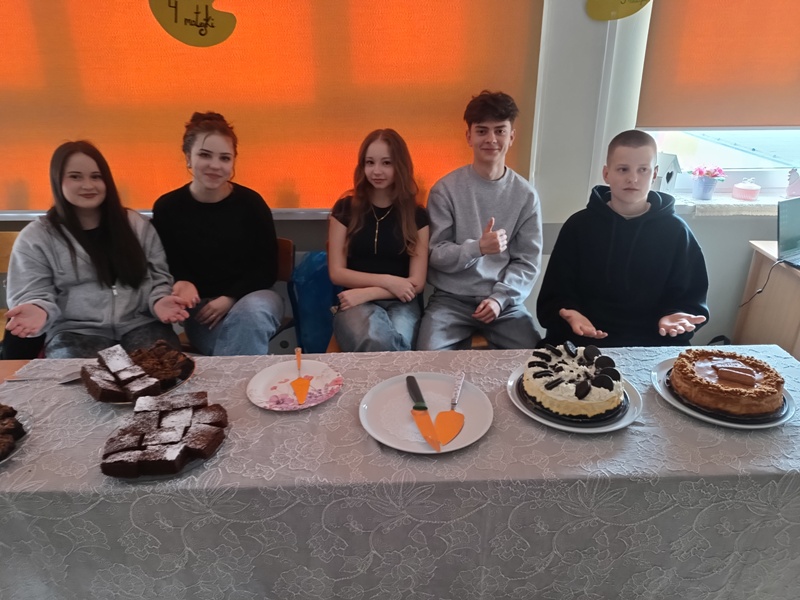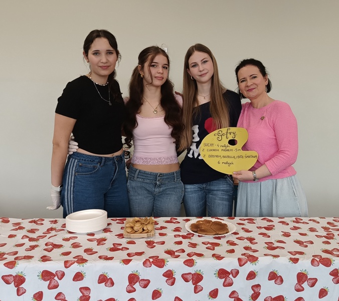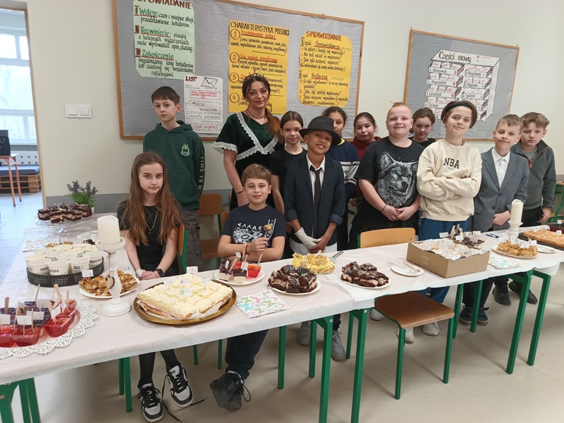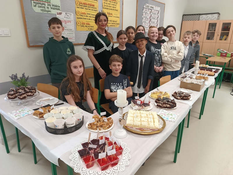 Och, jakież tam unosiły się niebiańskie aromaty… Gofry zwabiłyby chyba nawet śpiące jeszcze pszczoły, a popcorn podrywał wszystkie kiszki do marsza. Co tu dużo mówić (czy też pisać, jak na skrybę przystało), tego dnia z pewnością nikt nie chodził po szkole głodny. Wręcz można by podejrzewać, że niektórym grozi śpiączka od nadmiaru cukru, ale kto by się oszczędzał podczas Targów Matejkowskich? Nie po to całe noce Czwórkowicze spędzili przed kuchenką tudzież piekarnikiem, by odmawiać sobie odrobiny przyjemności w ten deszczowy, bury dzień. Mistrz Jan pomalowałby nam świat wszystkimi kolorami ze swej palety, ale cóż, nie mógł do nas dotrzeć w tym roku. Zapewne miał ważniejszą wizytę, choćby tę w Warszawie jego imienia, z którą właśnie się zaprzyjaźniliśmy. Niedługo będziemy pisać listy i życzenia do siostrzanej podstawówki, gdyż świętuje ona swoje 60-lecie (jesteśmy starsi!), a w przyszłości… kto wie, może zaprosimy jej uczniów na nasze słynne Matejkowskie Targi?