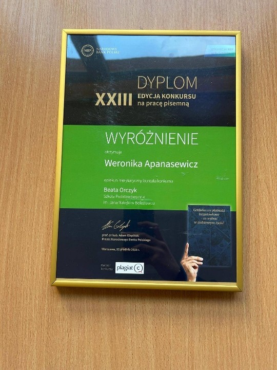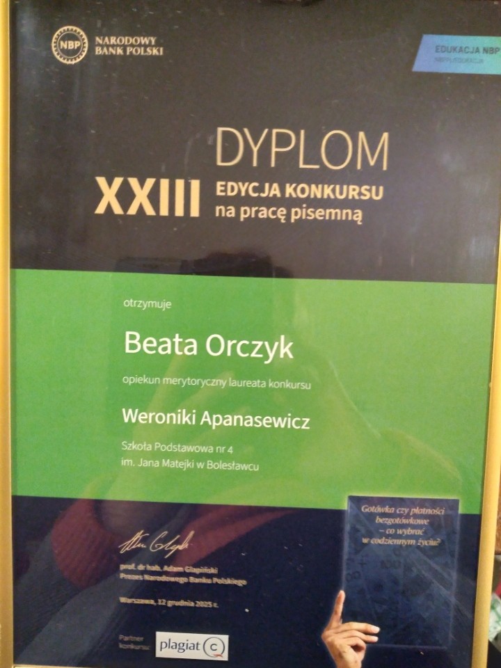 Jest mi niezmiernie miło poinformować, że uczennica klasy 8c - WERONIKA APANASEWICZ - znalazła się w gronie laureatów Konkursu pod egidą Narodowego Banku Polskiego.