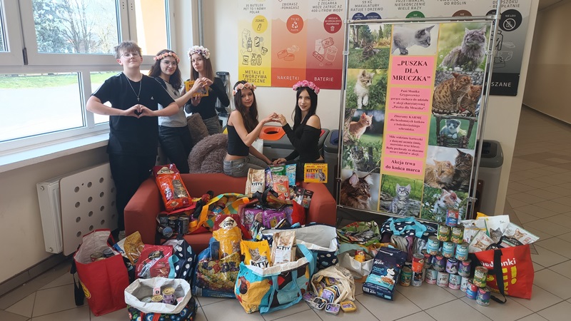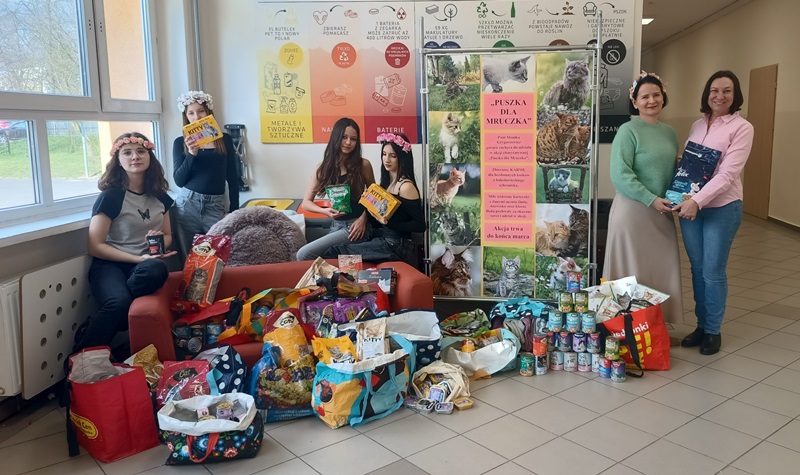 Jak co roku, w marcu zbieraliśmy karmę dla bezdomnych kotków żyjących na terenie Bolesławca i dokarmianych przez Panie ze Stowarzyszenia Pomocy Zwierzętom. Wszystkie zgromadzone produkty 8 kwietnia 2026 r. zostały dostarczone do siedziby stowarzyszenia i odebrane przez Panią Czesławę Szandrowską, główną opiekunkę bezdomnych Mruczków. Jak zawsze, na miejscu powitały nas urocze kotki, które już z daleka prezentowały piękne pozy, wdzięcząc się i dziękując za prezenty. Ich zaufanie, otwartość i szukanie kontaktu z człowiekiem były najlepszym dowodem na to, jak bogatą gamę uczuć posiadają te cudowne zwierzęta (jak zresztą wszystkie zwierzęta). To wielka radość móc pomagać słabszym od nas. I wielka odpowiedzialność, aby pamiętać o nich przez cały rok.
