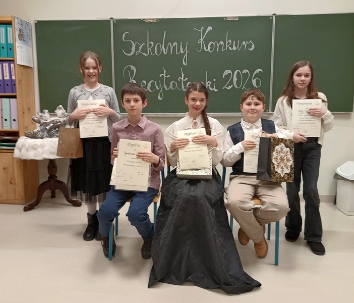 26 stycznia 2026r. w naszej szkole odbył się coroczny Konkurs Recytatorski „Pegazik”, będący zarazem eliminacjami do etapu miejskiego tego samego konkursu. W bieżącym roku szkolnym zgłosiło się do nas 19 utalentowanych uczniów z klas 4-8. Dziewięcioro z nich to uczniowie z klas 4-6, a druga dziewiątka to recytatorzy z klas 7-8. Po wysłuchaniu wszystkich prezentacji, nauczycielki zasiadające w jury wyłoniły troje laureatów z klas 4-6 oraz trzy laureatki z klas 7-8. Będą oni reprezentować Szkołę Podstawową nr 4 na szczeblu miejskim 6 marca 2026 o godz. 10.00 w sali BOK.