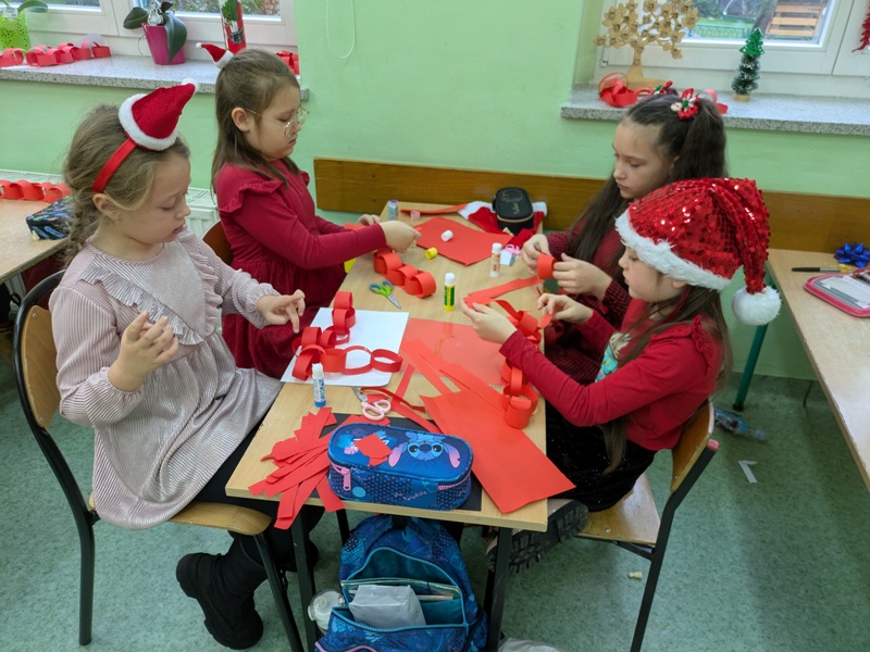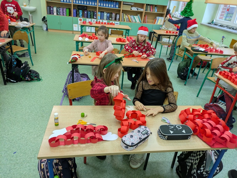 Doszły do nas wieści, że w okolicy naszej szkoły będzie przejeżdżał Święty Mikołaj! Chcieliśmy zrobić niespodziankę Mikołajowi i postanowiliśmy zrobić jego podobiznę. Nie taką narysowaną, tylko ręcznie robioną z kawałków kolorowych kartek! W nastrój wprowadziły nas piosenki jegomości Mikołaju.