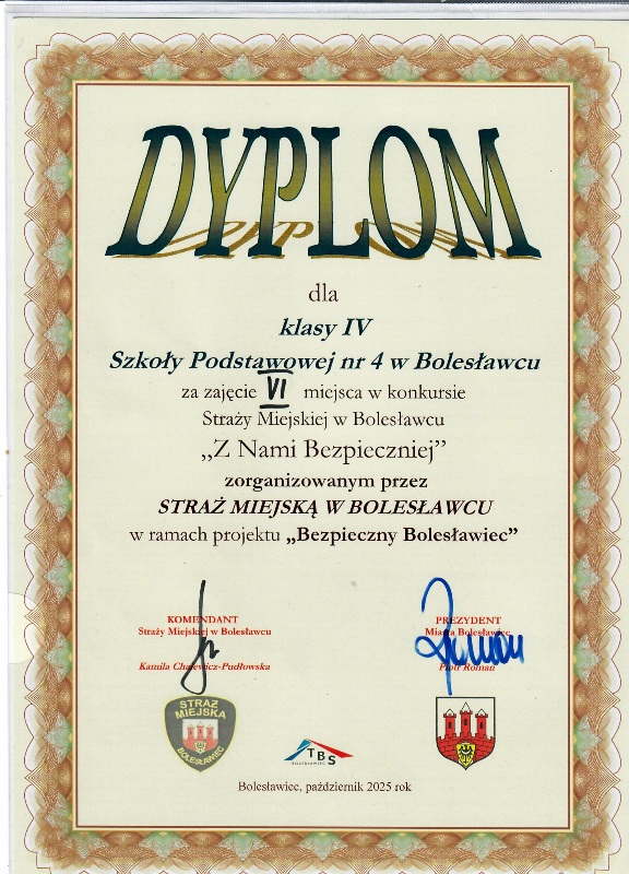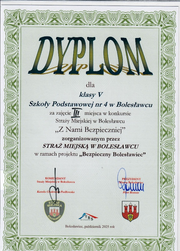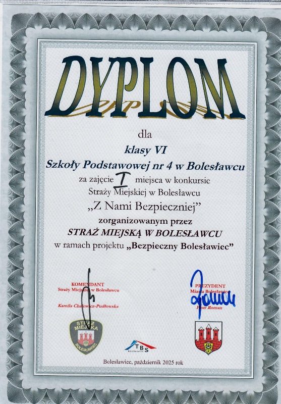 Za nami kolejny konkurs Straży Miejskiej w Bolesławcu skierowany do dzieci i młodzieży klas IV-VI szkół podstawowych na terenie miasta „Z nami bezpieczniej - 2025”. Zawody odbyły się 15 października 2025 roku w naszej szkole. Uczniowie rywalizowali w sprawdzianie teoretyczno-praktycznym. Uczniowie musieli się wykazać wiedzą o zagrożeniach jakie mogą spotkać w życiu codziennym i sposobach ich eliminacji. Wiechą z zakresu Prawa o ruchu drogowym na poziomie Szkoły Podstawowej.